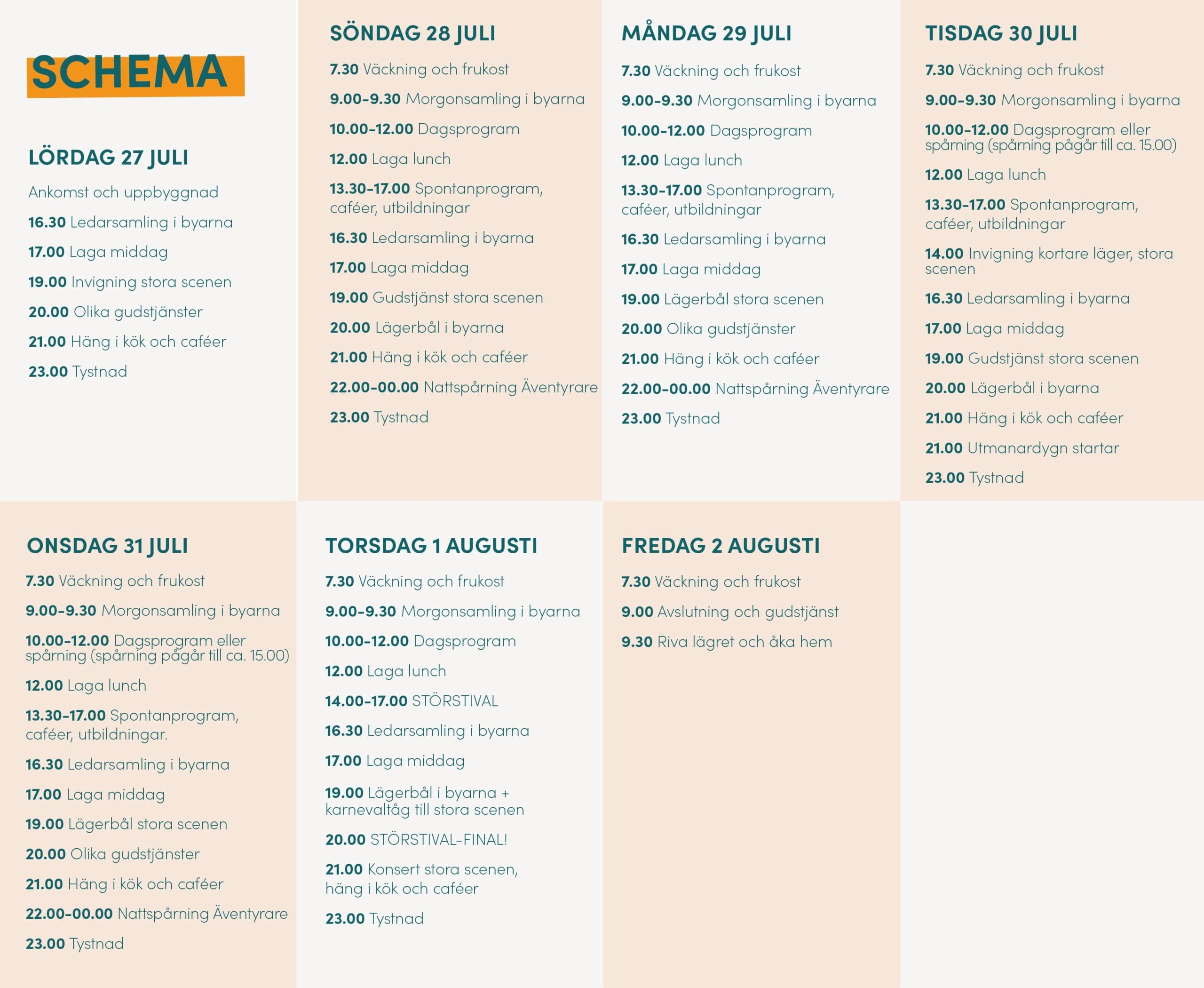 Nedan kommer ett grundschema för lägret. Mindre förändringar kan komma att ske. Vissa punkter och program kommer också att skilja sig mellan olika dagar.
